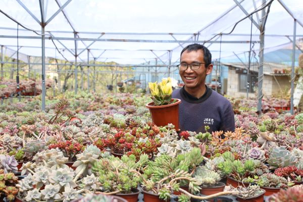 “永平心馨花缘花木盆景园”万盆多肉植物向阳生长,80后大学生茶绍铖流连其中,惬意一笑,温馨舒服。