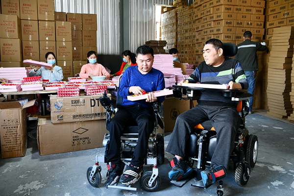逼仄房间里一张床,一张小桌板,一部手机,开着暖黄灯,显得有点昏暗,今年40出头的大哥郑金明坐在轮椅上,蜷缩着的双手艰难又专心地用手机回复顾客的提问。隔壁狭长电商办公室里,2台电脑,2台打单机滋滋作响,34岁的弟弟郑林明同样坐在轮椅上,一手敲键,一手接单,忙着赶货,满足客户需求。