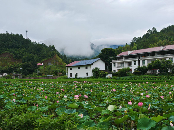 挑檐翘角的木制建筑,河水从前面静静淌过,旁边百亩花海绽放,“七星瑶寨”坐落在河谷中间,它集住宿、餐饮、漂流、观光于一体,如今已经成为乡村旅游的新景点。